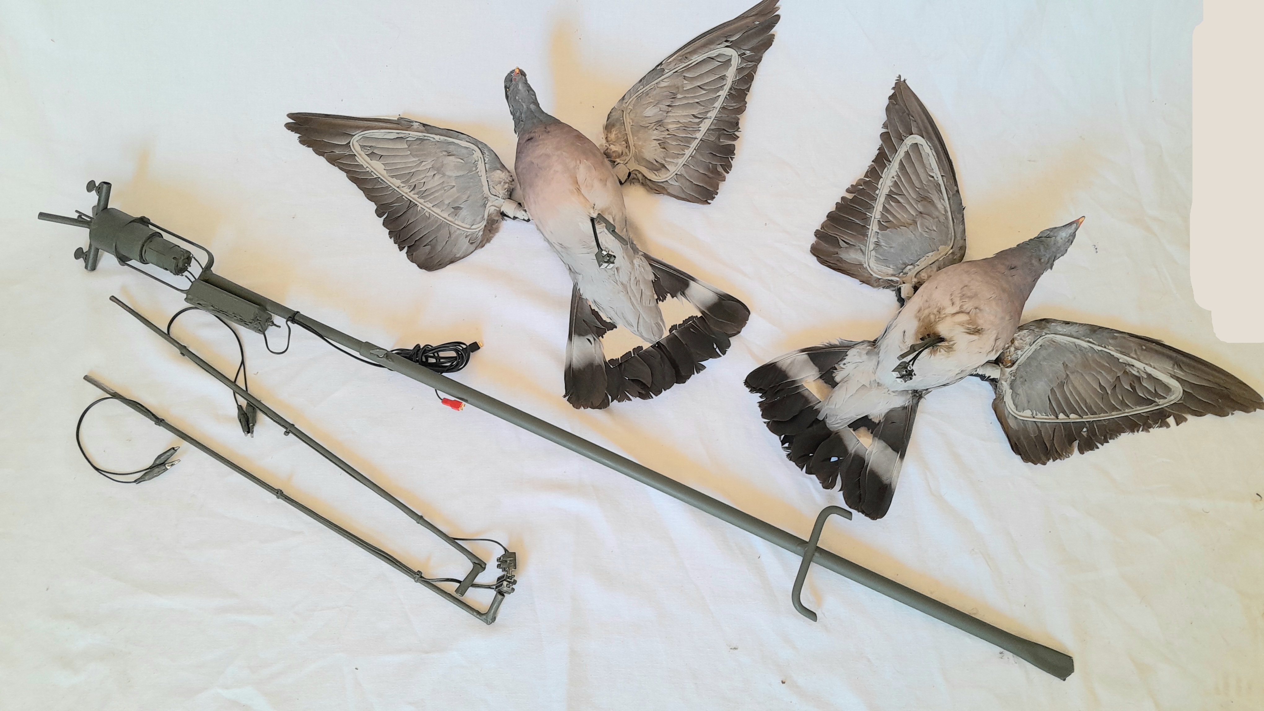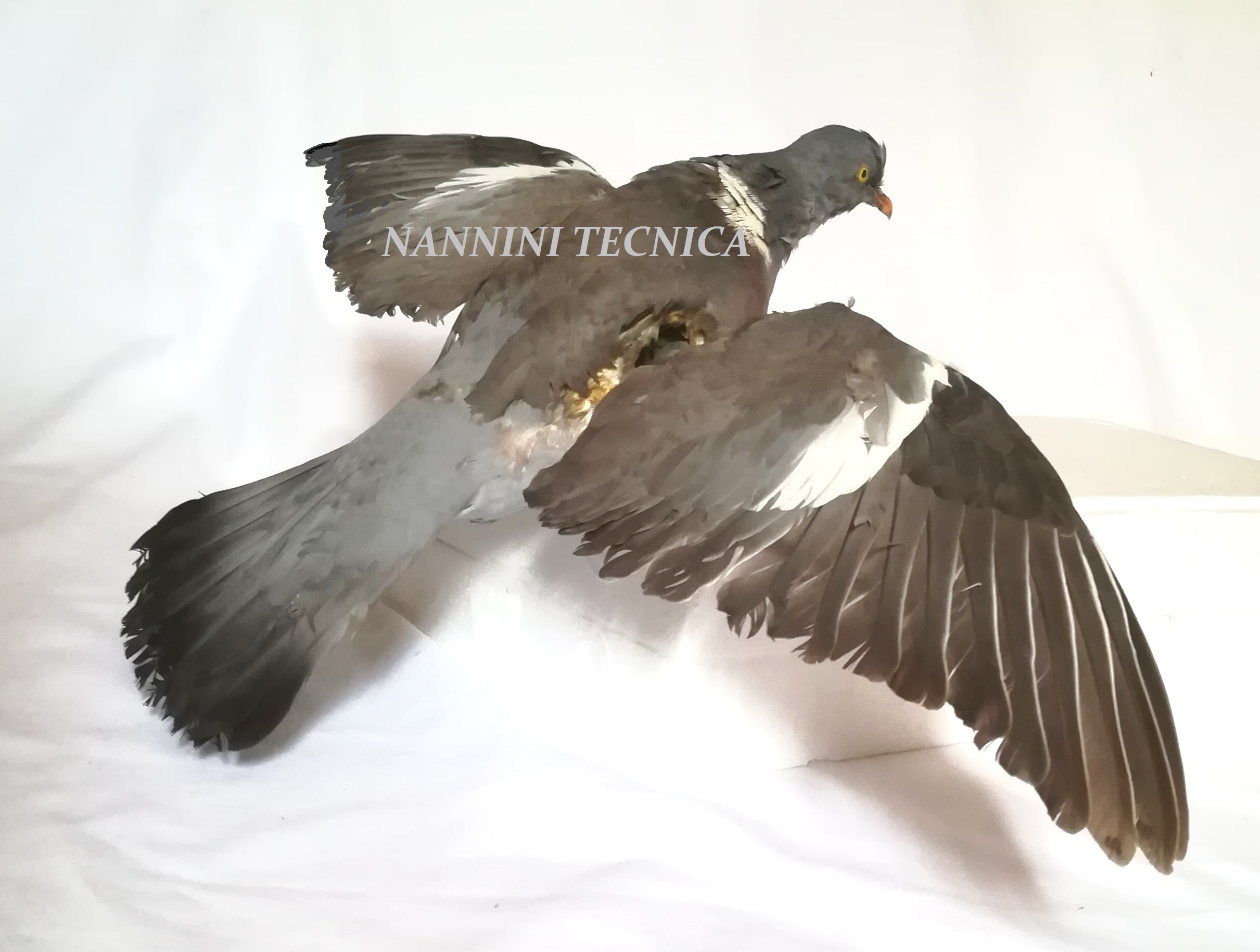 Questi colombacci impagliati hanno le ali parallele al terreno e funzionano o in continuo o col telecomando.